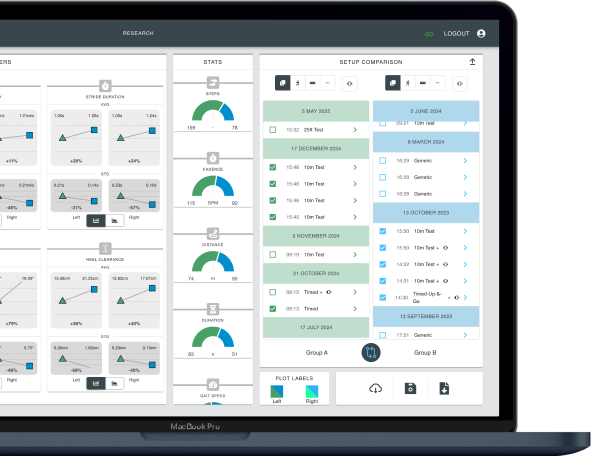 The analysis results are easily accessible through our dashboard. You can see the progress of your patients, compare individual assessments, and easily check whether your patient’s gait parameters are in the expected range by our intuitive color coded user interface.
